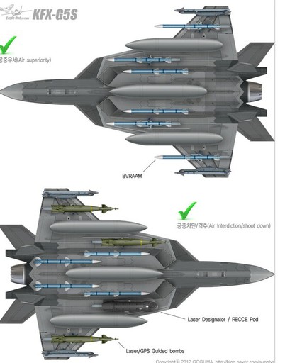 韓國(guó)公布的這組KFX-G5S戰(zhàn)機(jī)圖片中的另一關(guān)鍵技術(shù)要點(diǎn)是,有別于之前任何一款第五代戰(zhàn)機(jī)方案,韓國(guó)似乎在構(gòu)想KFX-G5S型戰(zhàn)機(jī)之初,就將外部掛載視作主要性能,而非像美制第五代戰(zhàn)機(jī)那樣,將外部掛載視作特殊情況下的無奈之舉。從韓國(guó)為KFX-G5S戰(zhàn)機(jī)規(guī)劃的掛載方案來看,作為輕型戰(zhàn)機(jī)的KFX-G5S,在無內(nèi)部掛載的情況下,外掛點(diǎn)超過10個(gè),基本達(dá)到F-16戰(zhàn)機(jī)的水平。如果再考慮第五代戰(zhàn)機(jī)較之第四代戰(zhàn)機(jī)較大的內(nèi)部空間帶來的機(jī)內(nèi)載油優(yōu)勢(shì),KFX-G5S型戰(zhàn)機(jī)的外掛能力應(yīng)在F-16之上。