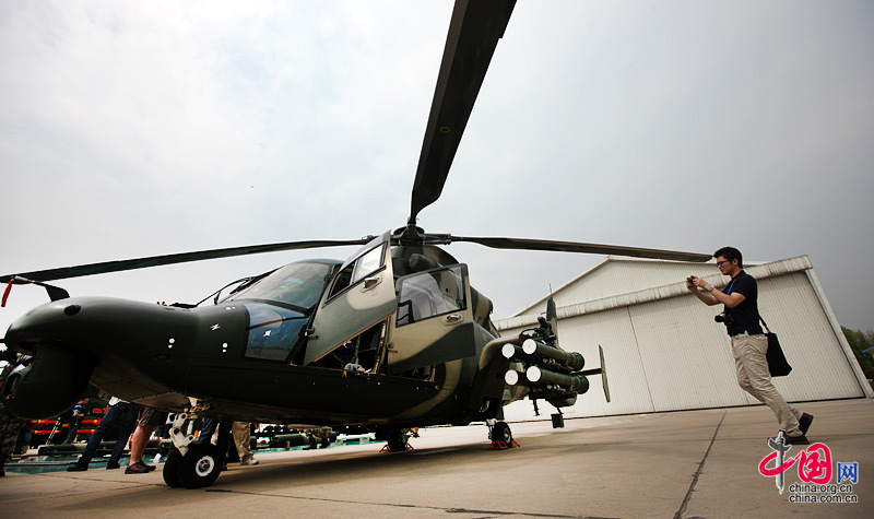 一名記者正在拍攝靜態(tài)展示區(qū)的直9-WZ武裝直升機。 攝影:中國網(wǎng) 楊佳