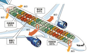 英國民航局委托、由格林威治大學實施的研究顯示,飛機上逃生可能性最大的座位是對著緊急出口的那排座位和緊急出口前面及后面的一排座位。最危險的座位是距離緊急出口6排和更遠的座位。該研究表示:坐在飛機前面的乘客,從火災(zāi)中安全逃生的可能性是65%,而坐在飛機后面的乘客逃生的可能性僅為53%。坐在過道里的乘客從火災(zāi)中安全逃生的可能性是64%,而其他乘客在這種情況下安全逃生的可能性僅為58%。