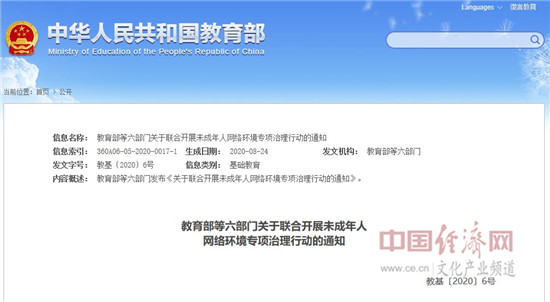 經濟日報-中國經濟網北京8月27日訊 日前,為營造良好安全的未成年人網絡環境,教育部、國家新聞出版署、中央網信辦、工業和信息化部、公安部、市場監管總局等六部門發文,聯合開展未成年人網絡環境專項治理行動。