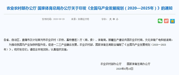 到2025年,我國現代馬產業發展的框架和體系初步形成,一二三產業融合發展格局初步形成,馬產業經濟效益和社會效益大幅提升,形成相對完備的現代化育種、高效養殖、診療保健、疫病防控、調教訓練、性能測定、競賽表演、健身休閑、文化旅游、產品加工和產業服務體系。