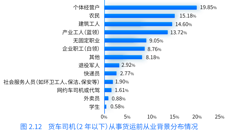 不僅如此,報告中還提到,過往貨運行業(yè)對傳統(tǒng)行業(yè)從業(yè)者的吸引力較強,多為農民、個體經營戶、產業(yè)工人(藍領)、無固定職業(yè)、建筑工人等群體。而近幾年,轉型從事貨車司機的職業(yè)還包含了企業(yè)職工(白領)、社會服務人員、學生等,另外,外賣員、快遞員、網約車司機及代駕司機等新型靈活就業(yè)者也有部分人群選擇轉行成為貨車司機。