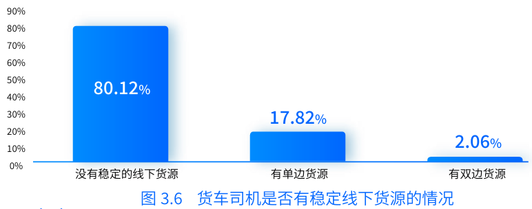 報告中提到,約80.12%的司機沒有穩(wěn)定的線下貨源供應,貨車司機很少能夠掌握穩(wěn)定線下貨源。大部分司機面臨貨運工作的不穩(wěn)定性,需要花費大量時間和精力去尋找和獲取貨源,這不僅降低了他們的運輸效率,也增加了運營成本。