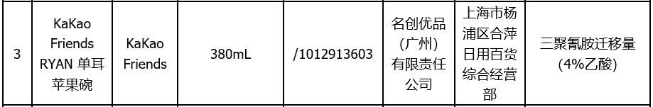 今年6月,上海市市場監管局網站發布的《2019年上海市兒童用餐具(密胺餐具)質量監督抽查結果》顯示,標稱名創優品(廣州)有限責任公司生產的標稱KaKao Friends RYAN 單耳蘋果碗(規格型號:380mL)被檢出三聚氰胺遷移量(4%乙酸)項目不合格。