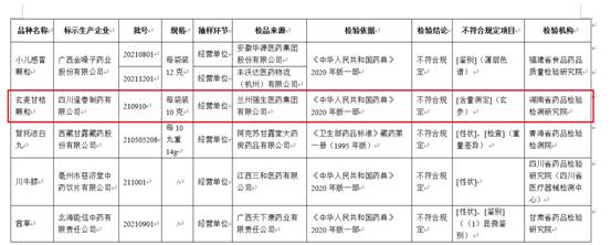 通告顯示,經湖南省藥品檢驗檢測研究院檢驗,標示為四川逢春制藥有限公司生產的1批次玄麥甘桔顆粒(批次:210910)不符合規定,不符合規定項目為含量測定。