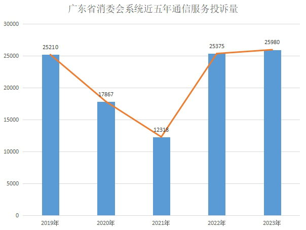 《報告》顯示,2019年至2023年,廣東省消委會系統(tǒng)共收到通信服務(wù)投訴106750件,占投訴總量的5.12%,呈現(xiàn)出先降后升的“V”字走勢。其中,前3年(2019年至2021年)相關(guān)投訴持續(xù)下降,從25210件降至12318件,平均降幅近三成。但隨著通信服務(wù)市場競爭日趨激烈、業(yè)務(wù)更加多元,2022年起通信投訴再度飆升,投訴量達(dá)25375件,同比上升106.00%,而2023年維持高位(25980件)。