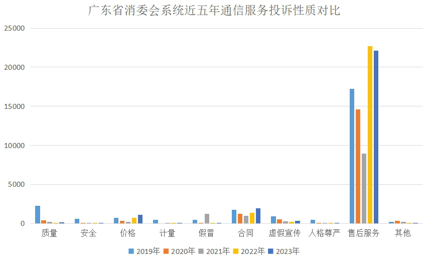 從投訴類別來看,近5年通信服務(wù)投訴95%以上集中在移動電話服務(wù),與當(dāng)前通信業(yè)發(fā)展現(xiàn)狀相符(2023年廣東固話、移動電話用戶數(shù)比例約為1:10)。從投訴性質(zhì)來看,消費者反映的問題主要集中在售后服務(wù)、合同和價格3類,其中售后服務(wù)問題最為集中,占投訴總量的80.19%,是通信服務(wù)類投訴增長變化的主要因素。從地區(qū)分布來看,通信服務(wù)投訴集中在消費活躍的珠三角地區(qū),主要與經(jīng)濟發(fā)展?fàn)顩r、人員密集程度相關(guān)。