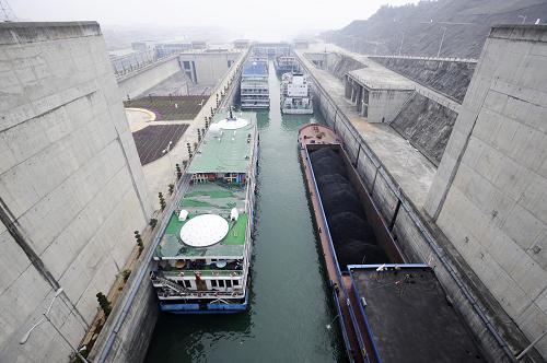 2008年2月23日,船舶在三峽船閘閘室內(nèi)等待過閘。2009年6月17日,三峽船閘安全穩(wěn)定通航6年,發(fā)揮了巨大的通航效益。截至6月底,三峽船閘累計運行近5萬閘次,過閘貨運量突破3億噸。新華社記者杜華舉攝