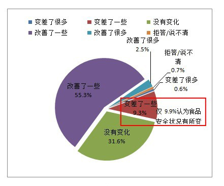 過去一年,國家多個部門發布了食品行業的新政策與新法規,對食品工業行業嚴加把關,多數市民也認為食品安全狀況得到了改善。55.3%的市民認為食品安全狀況改善了一些,2.5%的市民認為食品安全狀況改善了很多,而在2011年只有35.4%的受訪者認為食品安全狀況在過去一年有所改變,2012年比2011年提升19.9%。