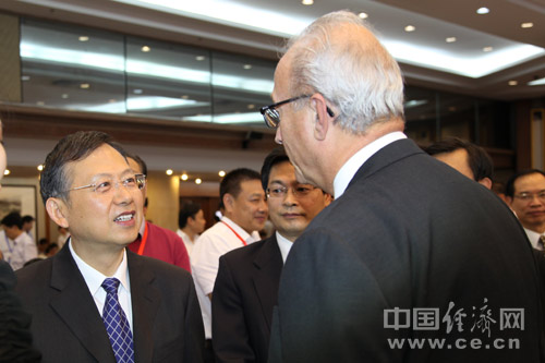 由中國(guó)道路交通安全協(xié)會(huì)、中國(guó)汽車技術(shù)研究中心和中國(guó)經(jīng)濟(jì)網(wǎng)共同主辦的“2013中國(guó)道路交通安全論壇”于8月29日在北京首都大酒店舉行。圖為公安部副部長(zhǎng)黃明與國(guó)際道路交通安全協(xié)會(huì)主席高斯進(jìn)行交流。中國(guó)經(jīng)濟(jì)網(wǎng) 郝紅波 攝影