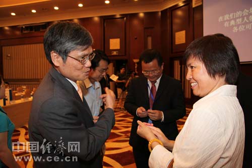 2013年全國食品安全宣傳周啟動儀式暨第五屆中國食品安全論壇6月17日在北京舉辦,今年主題為“社會共治 同心攜手維護食品安全”。圖為康師傅中央研究所所長楊乾輝與中國飲料工業協會理事長趙亞利進行交流。 中國經濟網 郝紅波/攝