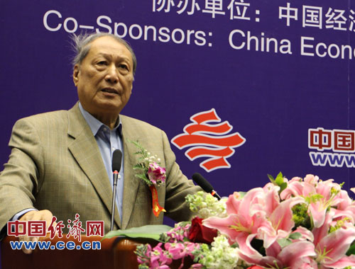 中國科學院預測科學研究中心1月26日(周五)在北京中科院數學與系統科學研究院舉辦“2013年中國經濟預測發(fā)布與研討會”。圖為中國科學院預測科學研究中心學術委員會主任 第七、八屆全國人大副委員長成思危致辭。中國經濟網楊瀟/攝影
