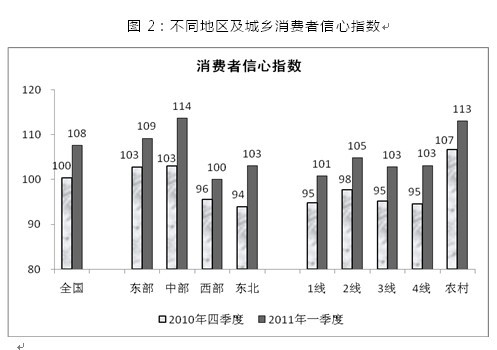2011年一季度中國(guó)消費(fèi)者信心指數(shù)為108,比2010年四季度大幅上升8點(diǎn),接近近兩年高點(diǎn)。消費(fèi)者對(duì)當(dāng)前經(jīng)濟(jì)形勢(shì)的滿意度和對(duì)未來經(jīng)濟(jì)走勢(shì)的預(yù)期樂觀度均明顯上升,持樂觀態(tài)度的消費(fèi)者比重均接近兩年內(nèi)的最高點(diǎn)。